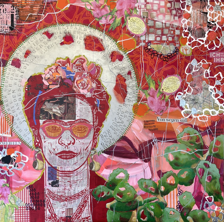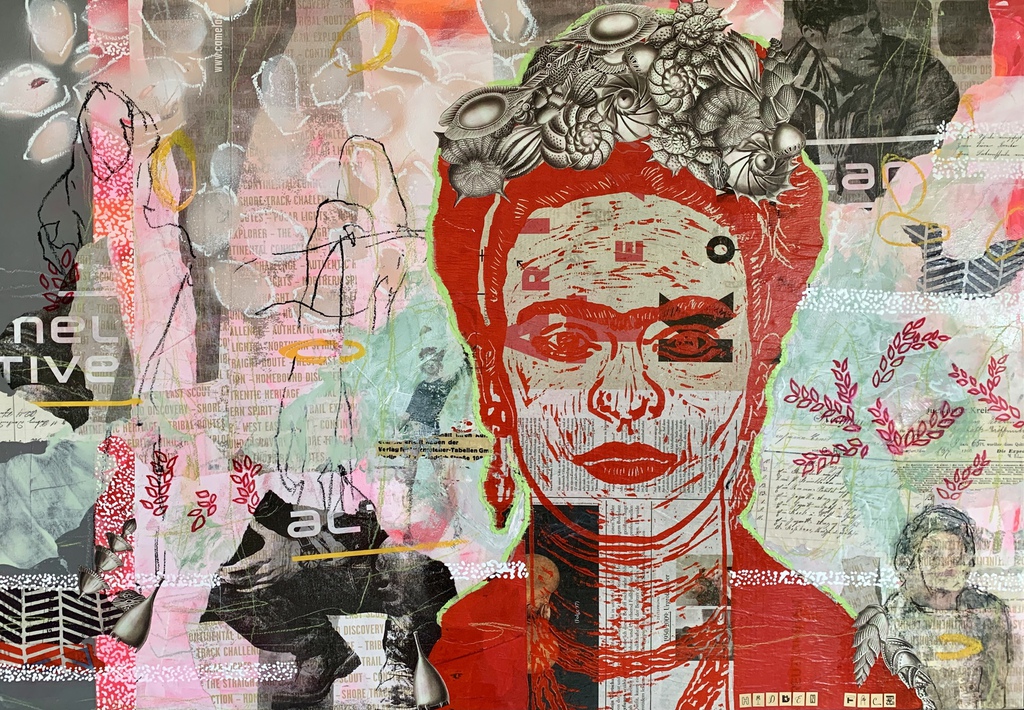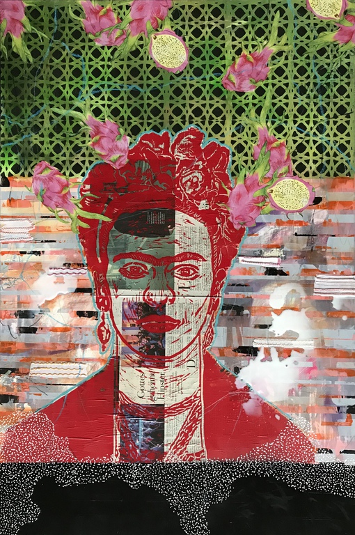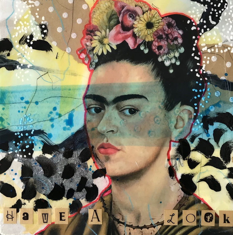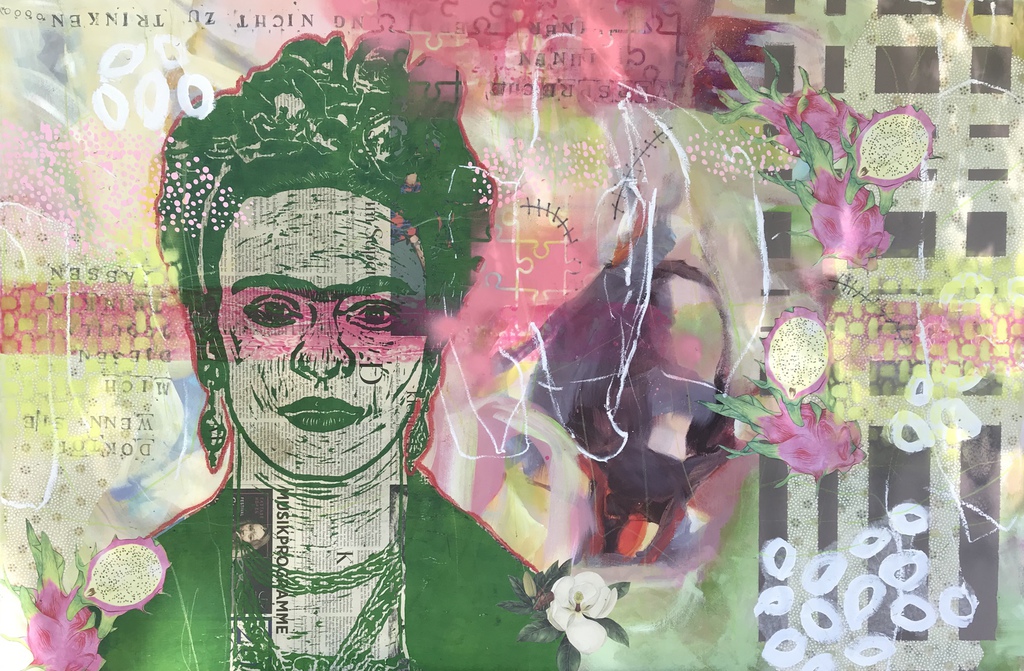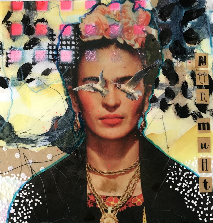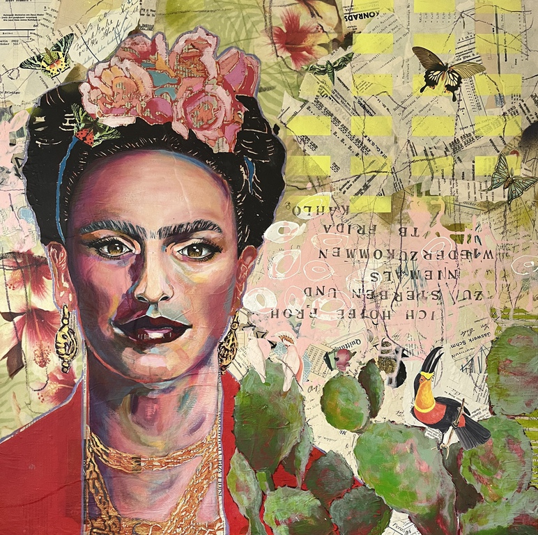Frida Kahlo, eine große Malerin und in erster Linie eine starke Frau. Allen Widrigkeiten, die ihr zuteil wurden, hat sie nie ihr Ziel aus den Augen verloren und ihre Selbstbildnisse zeugen von Auseinandersetzung mit sich selbst und der Umwelt. In meinen Arbeiten versuche ich diese Haltung zu verdeutlichen und dennoch zu differenzieren.